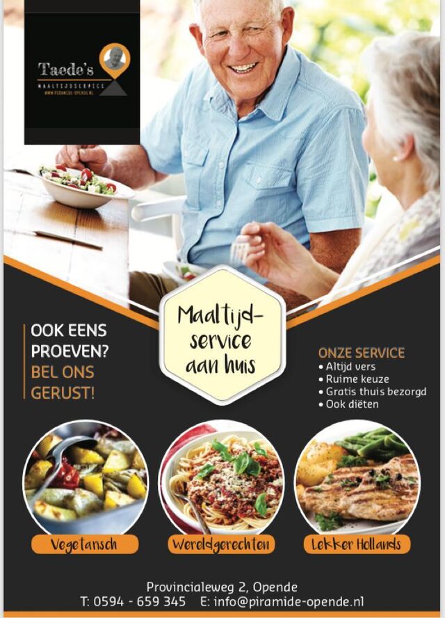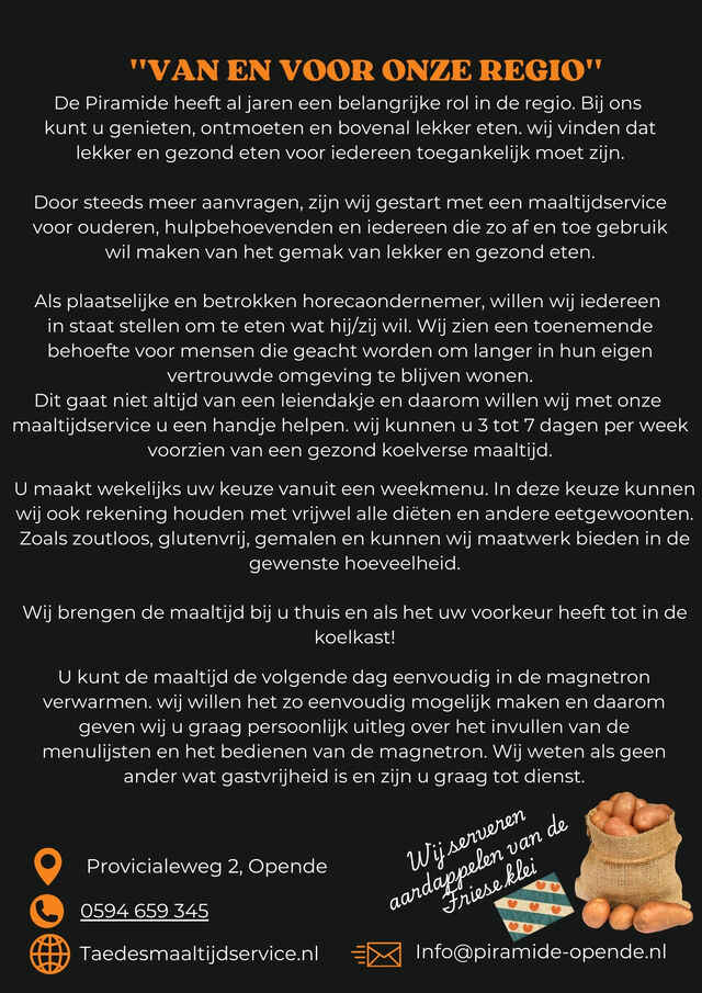 - Bijzondere voeding gewenst? - Wij bieden met onze maaltijdenservice bovendien veganistische en vegetarische gerechten aan – zo kan iedereen iets passends vinden. De keuze uit een groot aantal lactosevrije en glutenvrije gerechten maakt het voor u eenvoudiger om te genieten van onze maaltijden en daarbij zelfs op uw voeding te letten. Onze maaltijdservice biedt voor iedereen voldoende keuze. Met het oog op uw gezondheid dragen wij zorg voor gezonde maaltijden en laten wij zien dat gezond eten ook erg lekker kan zijn. Ga daarom voor gemak en lekker met de maaltijdservice van Piramide Opende.