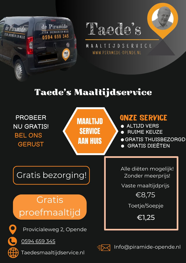- Bijzondere voeding gewenst? - Wij bieden met onze maaltijdenservice bovendien veganistische en vegetarische gerechten aan – zo kan iedereen iets passends vinden. De keuze uit een groot aantal lactosevrije en glutenvrije gerechten maakt het voor u eenvoudiger om te genieten van onze maaltijden en daarbij zelfs op uw voeding te letten. Onze maaltijdservice biedt voor iedereen voldoende keuze. Met het oog op uw gezondheid dragen wij zorg voor gezonde maaltijden en laten wij zien dat gezond eten ook erg lekker kan zijn. Ga daarom voor gemak en lekker met de maaltijdservice van Piramide Opende.